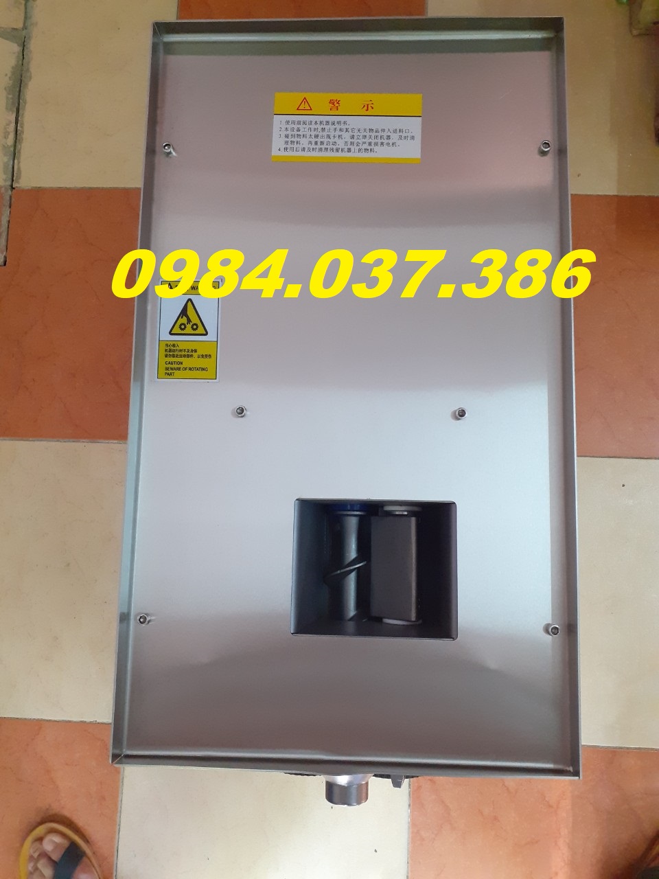 - Cho bột thuố-c đã chuẩn bị từ bước 1 vào lô máy (như hình dưới). Tại đây bột sẽ được 2 trục động cơ trong lô trộn đều và nén lại sau đó sẽ đùn ra khuôn máy làm viên hoàn thành từng sợi có kích thước (2 đến 12mm tùy từng loại khuôn)