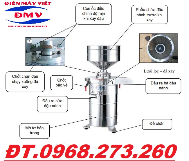 sử dụng động cơ có công suất 2200W, nguồn điện gia đình 220V dận dụng tiện lợi. Bộ phận nghiền của máy là 2 viên đá nghiền tròn với độ nhám cao, lực ép lớn cho năng xuất đạt từ 70-100kg/h/h, Với năng suất ấn tượng này, có thể dùng như một máy xay đậu nành làm đậu hũ , cho các cơ sở kinh doanh sữa đậu nành, tào phớ, đậu hũ, hay các quán ăn chay.